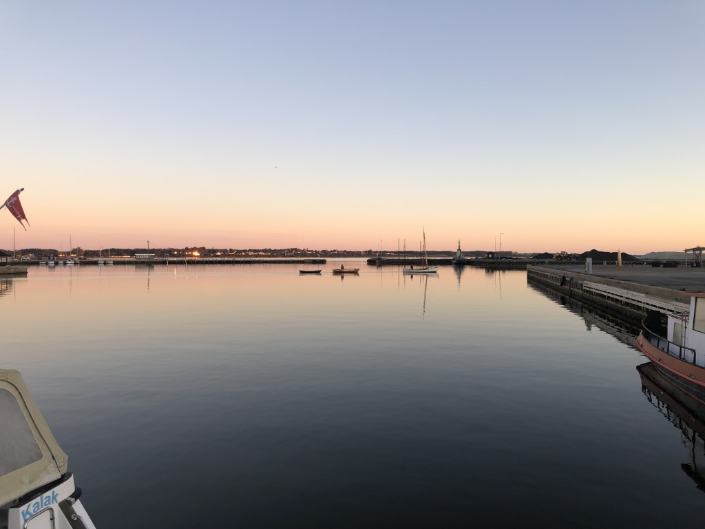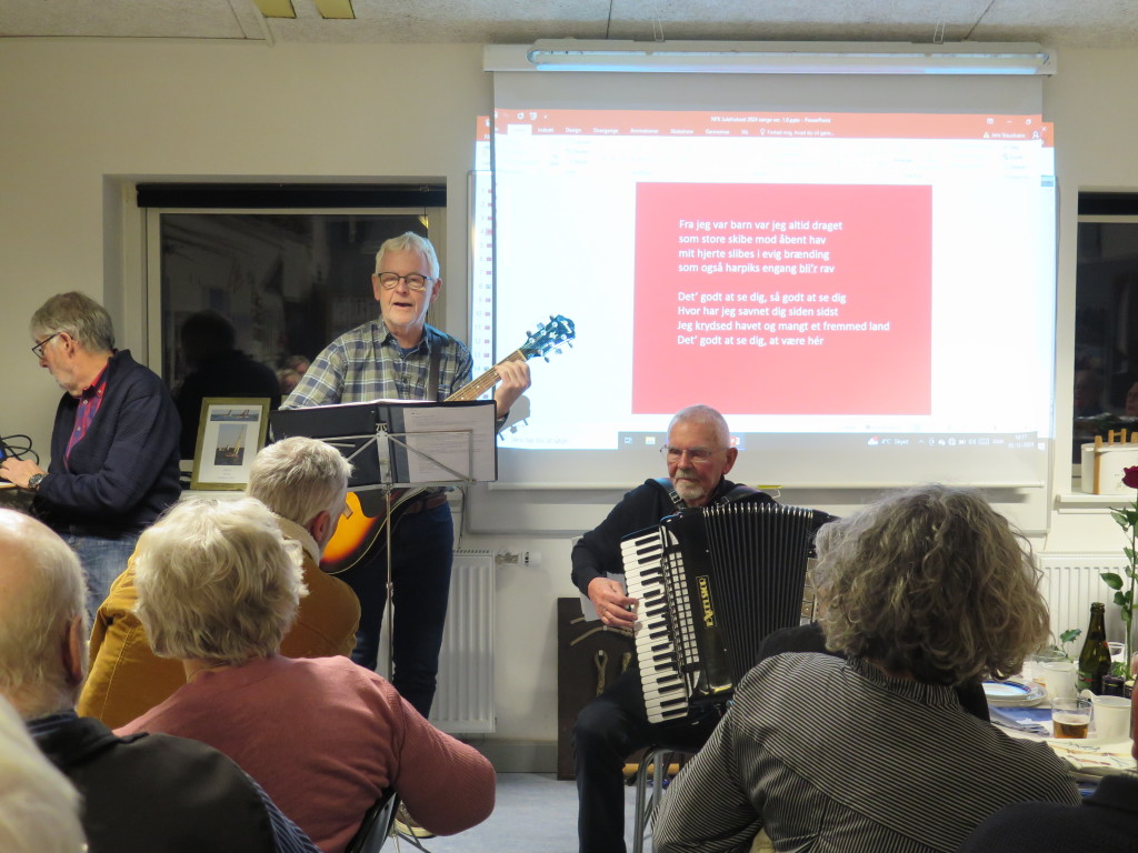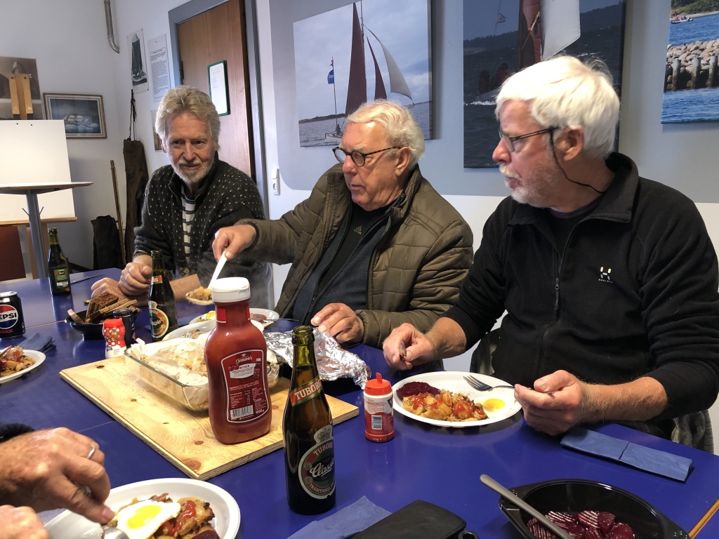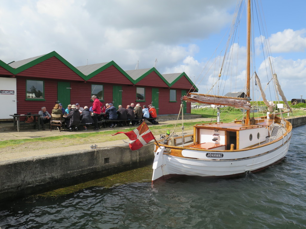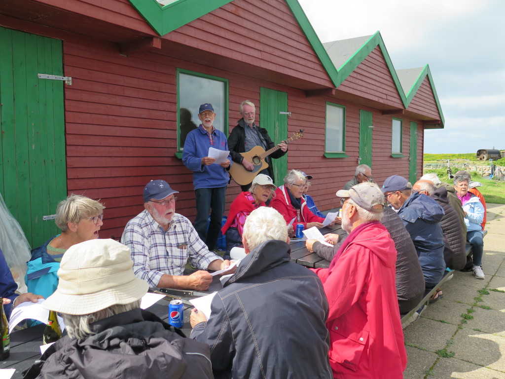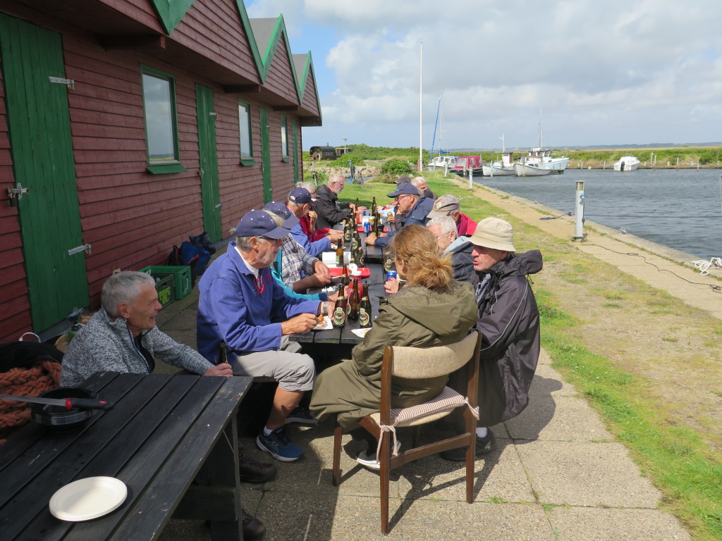 Vel i havn indrettede vi os med borde og bænke i læ for den friske vind bag de gamle rødmalede redskabsskure. Havnens grill blev tændt, og snart sad vi og nød de ristede pølser med øl og vand til. Vi nød samværet med snak og fællessang, og Osmund diverterede solo med sangen ”Fiskerens Himmerige” akkompagneret af Kristian på guitar.