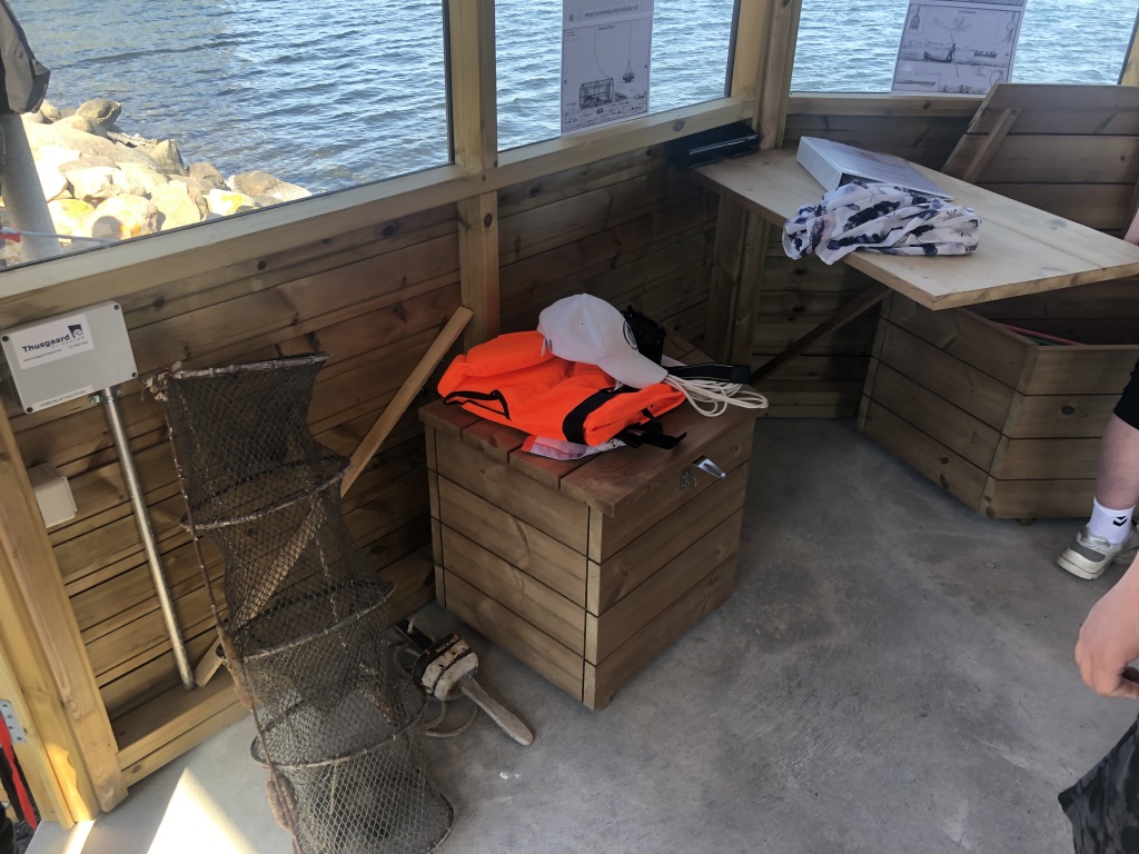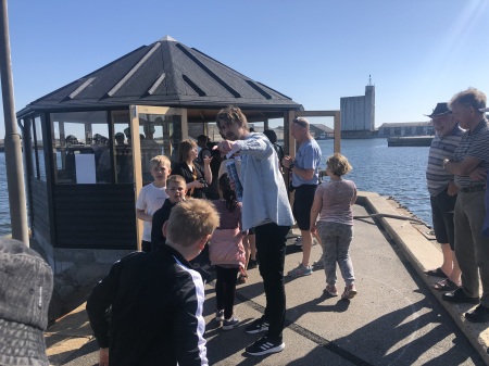 Efter flere års intens arbejde var vi blevet færdige med alle formalier og byggeriet ude på den yderste del af den gamle mole i havnen. Firmaet SH-pavilloner fra Erslev på Mors stod for opførelsen af pavillonen og Limfjordstømreren stod for etableringen af inventaret, der består af kistebænke og borde. Nede i kistebæn-kene ligger der materialer, så børn i alle aldre kan udforske livet i fjorden.