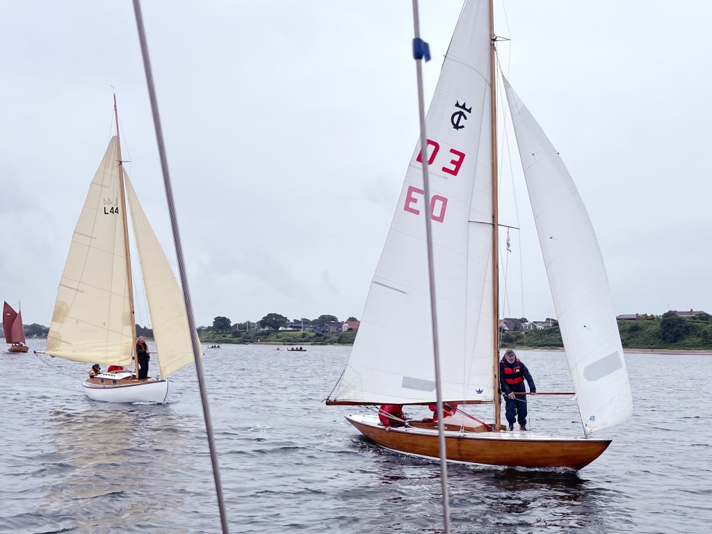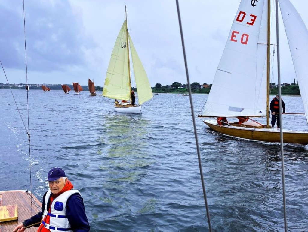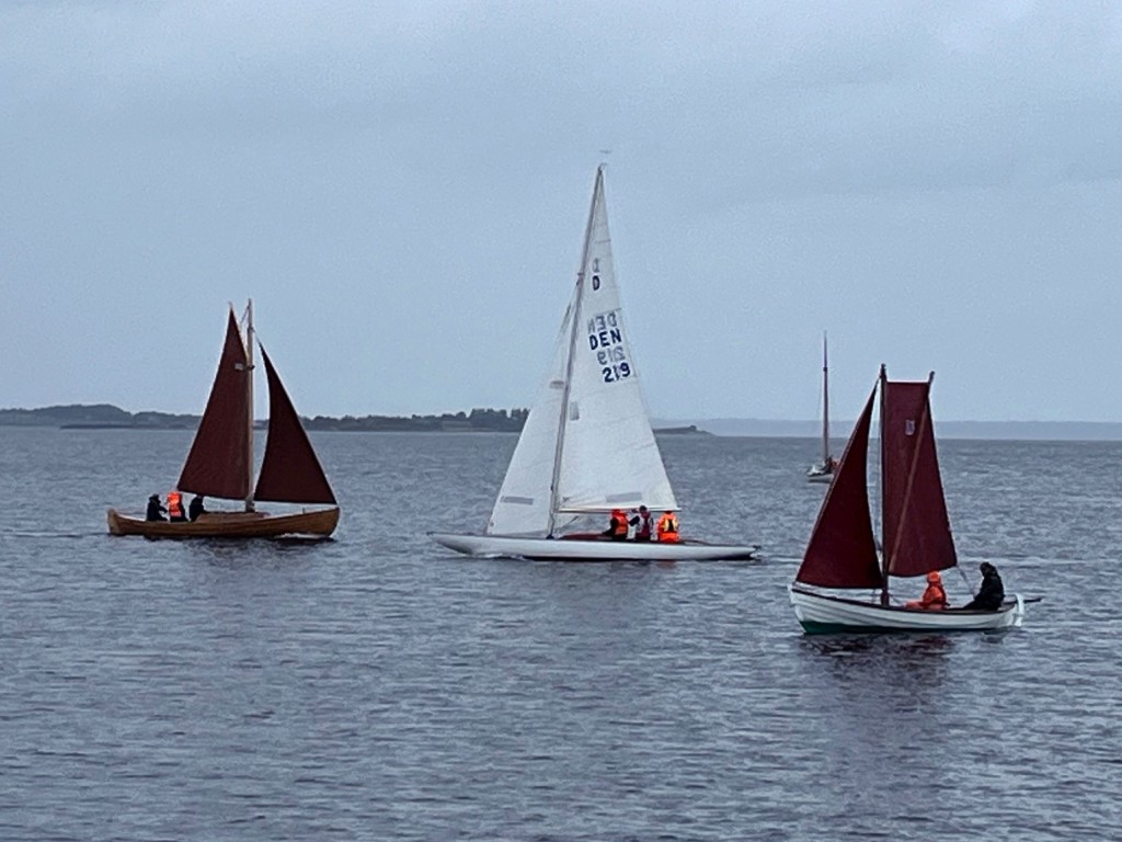 Første sejlads blev planmæssigt skudt i gang kl. 10.30 med en samlet start for alle bådene. Det småregnede, så bøjerne var lidt svære at se på lang afstand. Derfor skulle den ene følgebåd lægge sig over til bøjen øst for Vralden, så mandskaberne havde et mærke at sejle efter. Sejladsen gik godt i den friske vind. Om man bliver lidt våd af vandet fra oven eller fra fjorden kan vel komme ud på et.